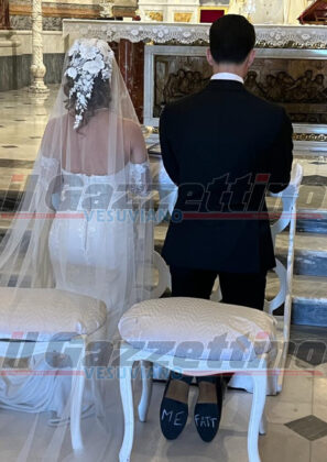 Il giorno fatidico del matrimonio, nella suggestiva Chiesa del Sacro Cuore di Castellammare di Stabia, il sacerdote ha chiesto agli sposi di inginocchiarsi in preghiera. Ma proprio in quel momento, sotto le suole delle scarpe dello sposo, è comparso un messaggio curioso. La scritta “m’è fatto” in dialetto napoletano ha attirato l’attenzione di tutti gli presenti, suscitando curiosità e divertimento.