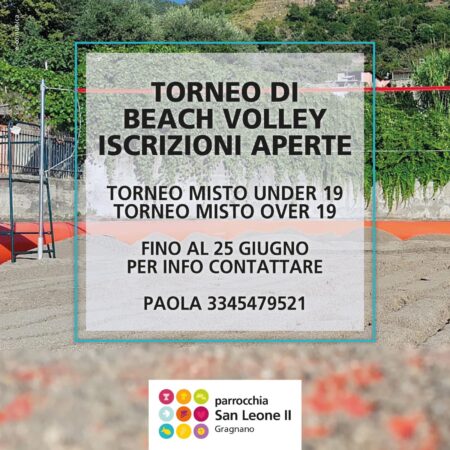 Sono ufficialmente aperte le iscrizioni per la II edizione per il tanto atteso torneo di beach volley della Parrocchia San Leone II di Gragnano. L’evento si terrà presso il parco della scuola media “Roncalli” di Gragnano, situato in viale Vincenzo Lombardi. Il torneo si svolgerà a partire dal 3 luglio e proseguirà per tutto il mese. Sono disponibili due categorie: