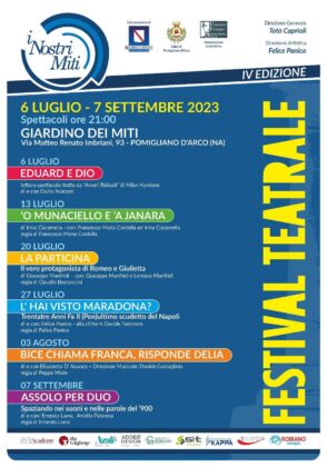 Giunge alla sua IV edizione il Festival teatrale “I Nostri Miti” a Pomigliano d’Arco. Quest’anno gli spettacoli partiranno il giorno 6 luglio e si concluderanno il 7 settembre con la fine della stagione estiva che come ogni anno si tinge di musica spettacolo e arte. Sei serate dedicate al teatro che, come dichiara l’organizzatore storico del Festival Carmine Antonio Caprioli: “Tingeranno il Giardino dei Miti della magia dell’evento che si compie, di un qui ed ora dove aspiriamo ad abbattere ogni quarta parete tra gli attori e il pubblico”.