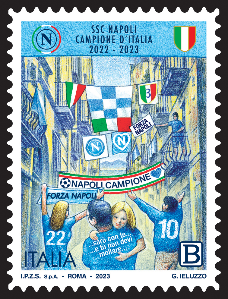 Ieri 13 luglio 2023, come comunicato da Poste Italiane, è stato emesso dal Ministero delle Imprese e del Made in Italy un francobollo ordinario appartenente alla serie tematica “lo Sport”, dedicato al Napoli Campione d’Italia, relativo al valore della tariffa B pari a 1,20€.