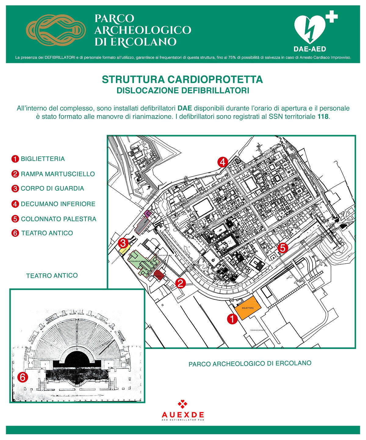 La pianta con l’ubicazione dei defibrillatori è a disposizione dei visitatori sul sito web del Parco: ercolano.beniculturali.it/oraricontatti.