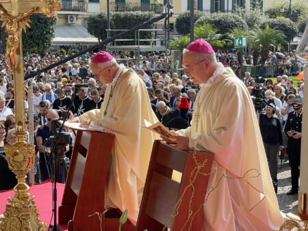 Una folla straordinaria ha gremito piazza Bartolo Longo, a Pompei, il primo giorno di ottobre, dinanzi al sagrato del Santuario, dove si è rinnovata la celebrazione della Supplica alla Beata Vergine del Santo Rosario, presieduta in quest’occasione da Monsignor Giuseppe Baturi, Arcivescovo di Cagliari e Segretario generale della Conferenza Episcopale Italiana, che ha presieduto la Santa Messa e, a mezzogiorno, la recita della celebre preghiera composta, nel 1883, dal Beato Fondatore Bartolo Longo.