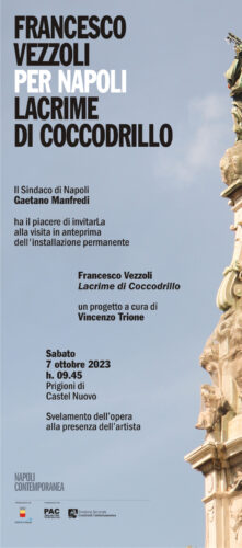 Il 7 ottobre 2023 alle ore 09.45 presso il Castel Nuovo sarà inaugurata l’installazione artistica Lacrime di coccodrillo di Francesco Vezzoli. Un nuovo appuntamento con Napoli contemporanea, la ricca programmazione di mostre e installazioni voluta dal sindaco Gaetano Manfredi e curata da Vincenzo Trione, consigliere del sindaco per l’arte contemporanea e l’attività museale.