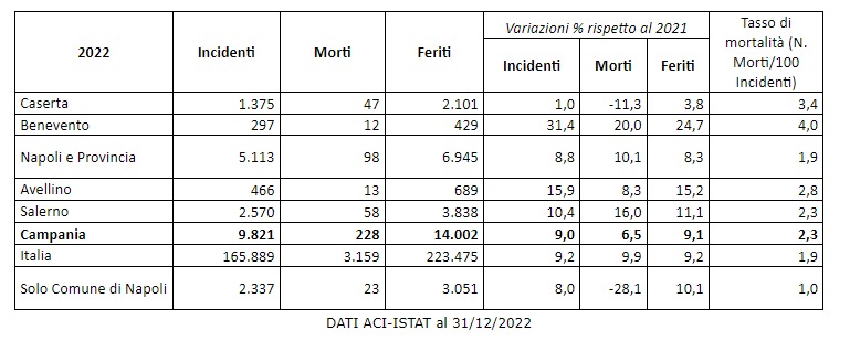 Nella provincia di Napoli, lo scorso anno, si sono verificati 5.113 incidenti (+8,8% rispetto al 2021) con 98 morti (+10,1%) e 6.945 feriti (+8,3%).