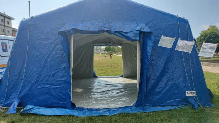Una tenda pneumatica è stata montata per l’accoglienza dei feriti