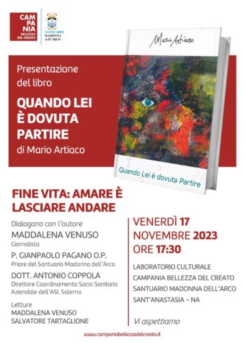 Venerdì 17 novembre 2023, alle ore 17:30, Padre Gianpaolo Pagano, priore del Santuario della Madonna dell’Arco in Sant’Anastasia, il Dott. Antonio Coppola, Direttore Coordinamento Socio Sanitario Aziendale dell’Asl Salerno, Maddalena Venuso, giornalista, discuteranno con Mario Artiaco, autore di Quando lei è dovuta partire, del Fine Vita e dell’Amore che è capace di lasciare andare.