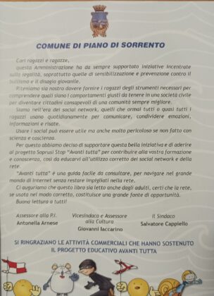 Utilizzare la Rete in modo corretto e costruttivo, con la consapevolezza legata anche ai rischi dettati da fenomeni gravi come ad esempio il cyberbullismo. Un progetto di spessore che coinvolge non solo gli alunni di Piano di Sorrento, ma anche e soprattutto famiglie ed educatori. Sensibilizzare è il grande obiettivo del libro “Avanti tutta!”, un progetto che, con passione e determinazione, l’Amministrazione comunale di Piano di Sorrento ha deciso di supportare per favorire la crescita delle nuove generazioni, dei genitori e degli educatori.