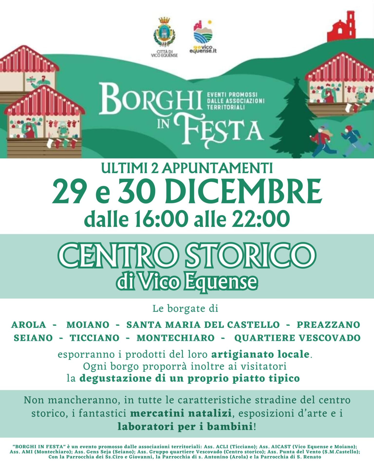 Negli ultimi due giorni della manifestazione, le borgate di Arola, Moiano, Montechiaro, Preazzano, Seiano, Santa Maria del Castello, Ticciano e il quartiere Vescovado esporranno insieme i prodotti del loro artigianato locale. Ogni borgo proporrà inoltre ai visitatori la degustazione di un proprio piatto tipico. Non mancheranno, in tutte le caratteristiche stradine del centro storico, i fantastici mercatini natalizi, esposizioni d’arte e i laboratori per bambini.
