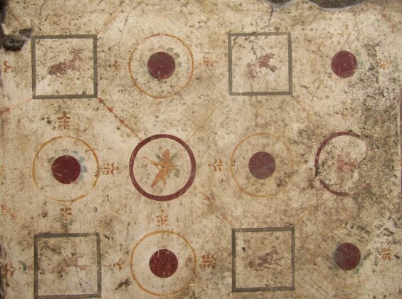 Su una delle pareti invece dell’atrio è emerso l’affresco di una natura morta – che ricorda la “pizza” dei nostri giorni- raffigurante una focaccia di forma piatta che funge da supporto per frutti vari (individuabili un melograno e forse un dattero), condita con spezie o forse piuttosto con un tipo di pesto (moretum in latino), indicato da puntini color giallastro e ocra. Sullo stesso vassoio, frutta secca e una ghirlanda di corbezzoli gialli, accanto a datteri e melograni. Si tratta di un genere di immagini, noto in antico con il nome xenia, che prendeva spunto dai “doni ospitali” che si offrivano agli ospiti secondo una tradizione greca, risalente al periodo ellenistico (III-I secolo a.C.).