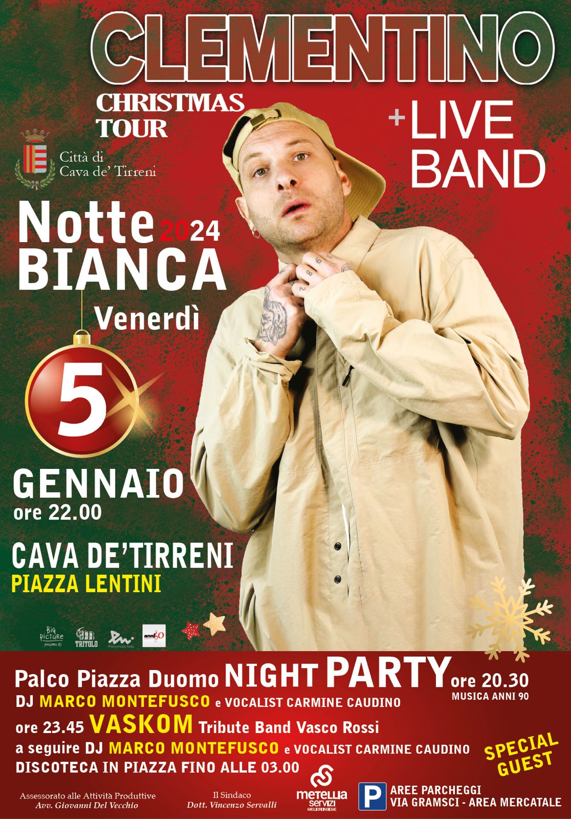 Mettere insieme nelle piazze le persone di tutte le età, dalla signora che lo guarda a The Voice al nostalgico che vuole il rap dei suoi primi dischi, è la sua specialità come ha dimostrato anche con il Clementino Live 2023, uno dei tour tra i più visti la scorsa estate in Italia con mezzo milione di spettatori. Ad accompagnarlo sul palco la Live Band composta da Francesco Varchetta – batteria, Luigi Ferrara – basso, Silvestro Saccomanno – tastiere, Raffaele Salapete – chitarra, Greg Rega – voce.