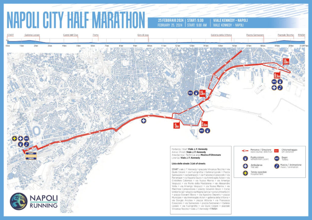 Da qualunque parte la si guardi, Napoli non può che sorprendere per la sua straordinaria bellezza che nei secoli ha ammaliato artisti di ogni genere. Frasi celebri hanno provato a raccontarne il fascino, l’arte, la semplicità, la musicalità, l’allegria, la leggerezza e tutta la storia che ne hanno riconosciuto il centro storico come Patrimonio Mondiale UNESCO dal 1995, grazie alla sorprendente capacità di raccontarsi come città tra le più antiche d’Europa attraverso un tessuto urbano contemporaneo. Bellezza da vivere lungo il percorso di gara che mette insieme anche le caratteristiche salienti di alto livello tecnico e velocità. Un mix esplosivo in termini di opportunità di realizzare una gara strabiliante, complici le condizioni metereologiche ottimali (~10°C), che potrebbe persino vedere vacillare il primato italiano maschile di mezza maratona di 59’26” realizzato, proprio qui, dall’azzurro Yeman Crippa (Polizia).