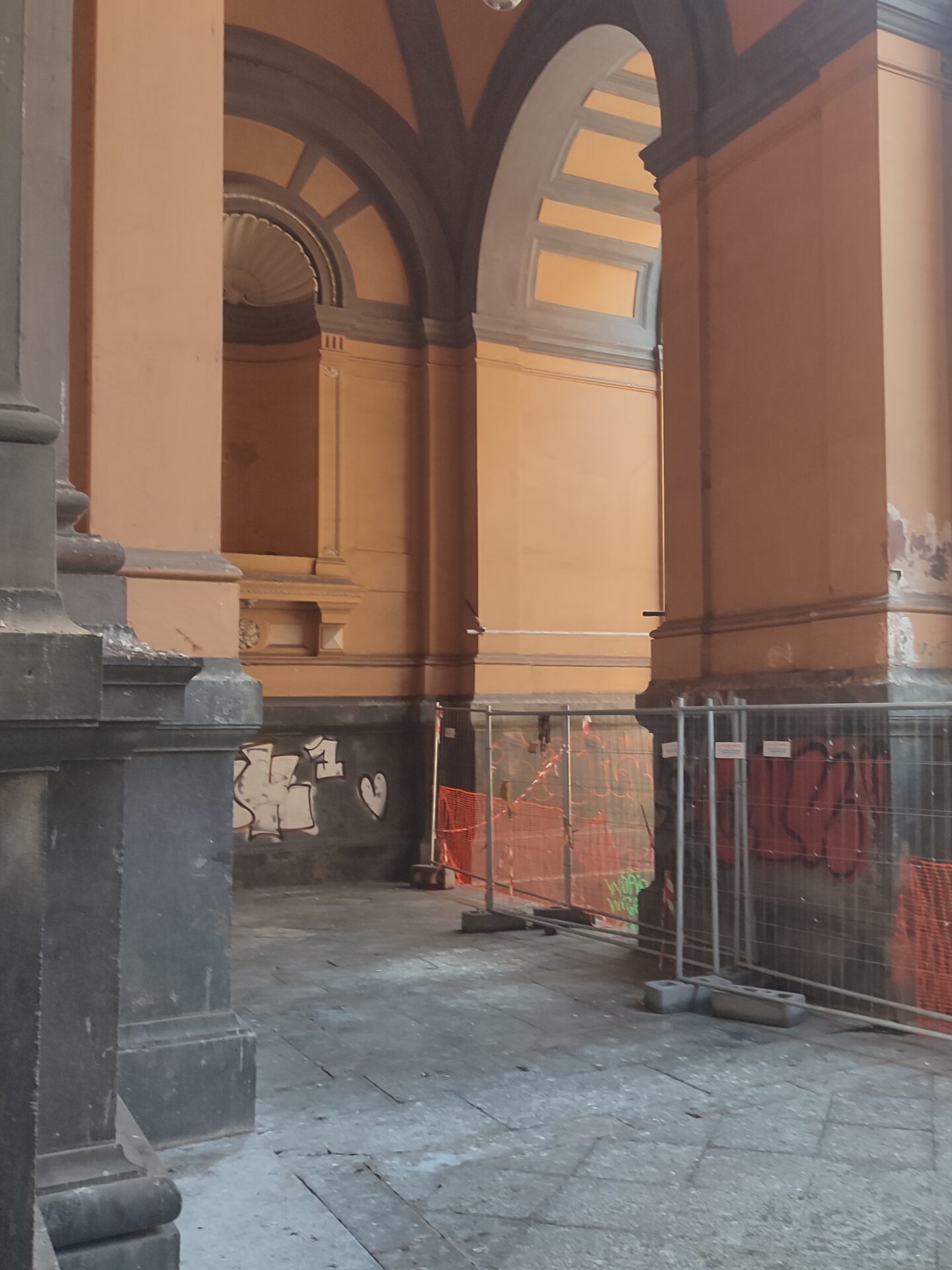 Abbiamo documentato dettagliatamente in diversi nostri articoli riguardo ai clochard (il 31.10.2022 ed il 15.11.2022, quando abbiamo segnalato anche le infiltrazioni d’acqua), che nel corso degli anni erano presenti, non solo di fronte al Museo Archeologico Nazionale di Napoli (quindi dal lato di Piazza Museo), ma anche dal lato dell’ingresso di Via Pessina, cioè la strada che collega proprio Piazza Museo (l’area del MANN appunto) a Piazza Dante, zona che porta i visitatori sulla storica Via Toledo.