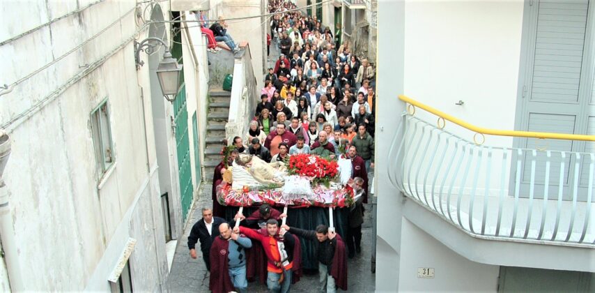 Organizzata dai Turchini, la processione propone tavole plastiche che rimandano alla vita di Cristo e a episodi biblici. Il corteo a Terra Murata è annunciato dal lamento di una tromba. A Pagani Cristo e Addolorata vanno in processione con la banda, per le stradine del centro antico. A Cava dei Tirreni … un prete con un piede scalzo bussa per tre volte alla porta della chiesa mentre il sagrestano, che impersona Ponzio Pilato, lo respinge. A Sarno, le “Croci” propongono i “Paputi” incappucciati e i canti sacri eseguiti dai fedeli al suono della troccola.