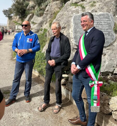 Arroccati su questo sentiero, non lo sono. Mentre lo percorro sono di nuovo un pagano politeista». È il meraviglioso pensiero di Erri De Luca, impresso sulla targa svelata ieri sul Sentiero degli Dei dal celebre scrittore, affiancato dal sindaco di Agerola Tommaso Naclerio e dal vicesindaco Luca Mascolo.