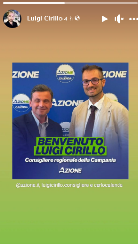 Appena un mese fa, sui suoi social, pubblicava un endorsement politico a favore di Nicola Caputo, assessore regionale all’Agricoltura e candidato alle prossime elezioni europee nella federazione Stati Uniti d’Europa. Oggi, per il consigliere regionale Luigi Cirillo (eletto nelle liste del Movimento 5 Stelle e passato poi a Più Europa) è arrivata l’ennesima giravolta: addio al partito di Emma Bonino, aderisce ad Azione di Calenda.