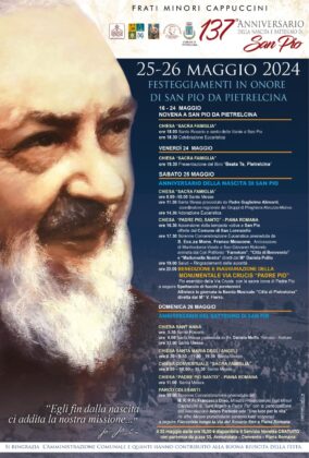 I festeggiamenti saranno preceduti nella chiesa conventuale della “Sacra Famiglia”; il 24 alle ore 19.30, dalla presentazione della nuova edizione del famoso libro “Beata te, Pietrelcina” scritto circa 30 anni fa da padre Lino da Prata (ex superiore del Convento di Pietrelcina) e da padre Alessandro da Ripabottoni (biografo storico di Padre Pio).