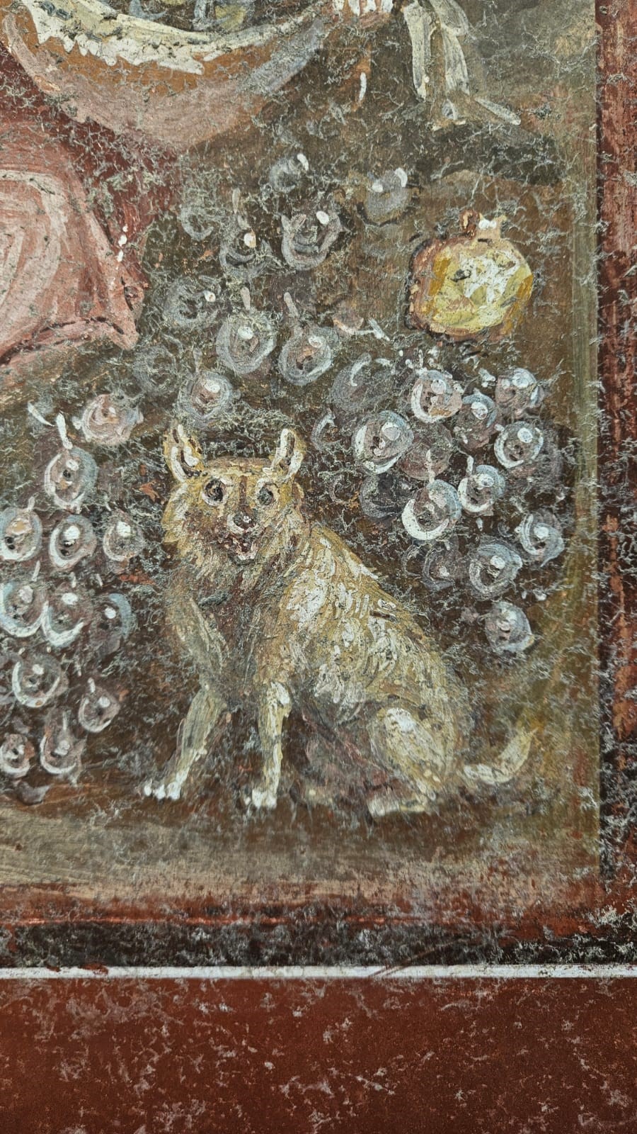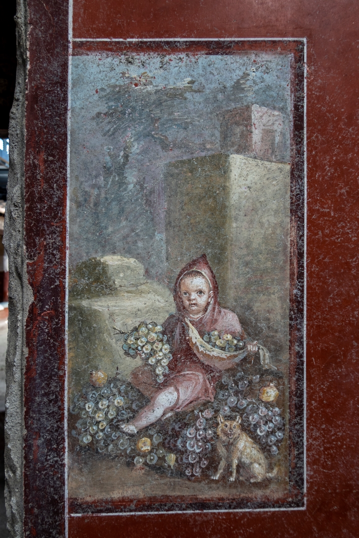 Su un’altra parete ancora, un quadretto più piccolo raffigurante, in maniera alquanto inedita, un bambino con cappuccio e mantello da viaggiatore, circondato da grandi grappoli d’uva e melagrane; al suo fianco un cagnolino. Posto vicino all’apertura che affaccia sul triportico (giardino con portico a tre bracci), la scena crea un gioco di illusione prospettica con il giardino.