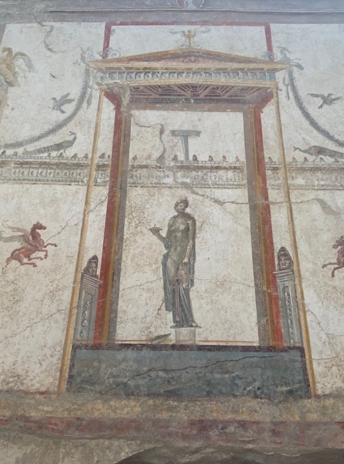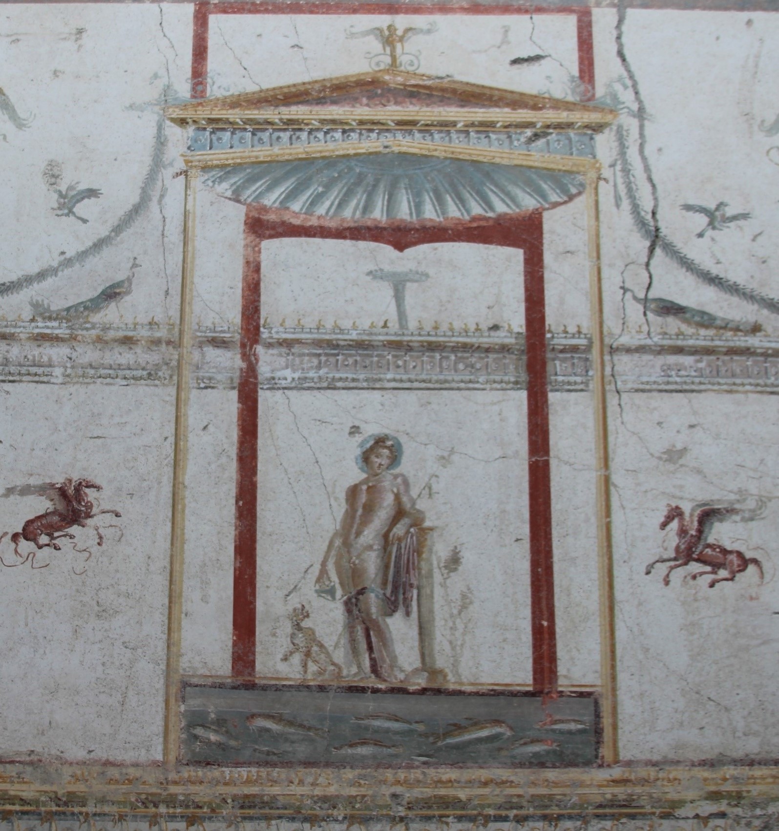 Tra gli ambienti portati alla luce nel corso degli scavi archeologici, nella Casa dei Pittori al lavoro ne emerso uno dalle raffinate pareti affrescate in IV stile. La porzione superiore a fondo bianco è decorata con figure mitologiche (centauri, sirene, grifi) che incorniciano l’immagine di una divinità, presente su ciascun lato. Si riconoscono Afrodite, Apollo e Dioniso e una quarta divinità (molto probabilmente una figura femminile) non ben leggibile, a causa di una breccia sulla parete di riferimento.