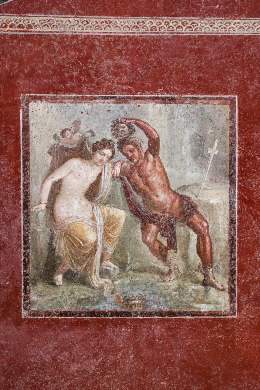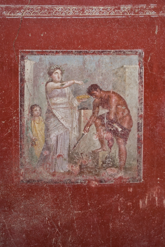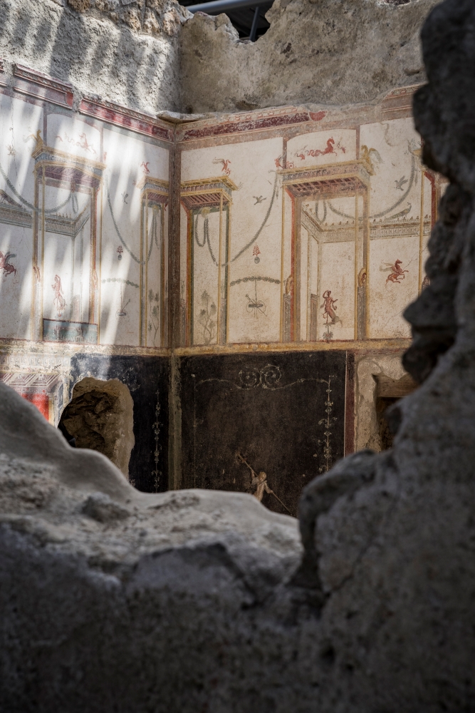 Questo ambiente ancora in corso di scavo era interamente obliterato dal flusso cineritico. Gli interventi sono consistiti, contestualmente alla rimozione meccanica della cinerite, nella pulitura e consolidamento della superficie pittorica ad opera dei restauratori. Il registro di mezzo con pannelli a fondo rosso presenta, invece, quadretti dipinti direttamente sul colore. Nelle scene si riconoscono Perseo e Andromeda da un lato e la purificazione di un eroe dall’altro.