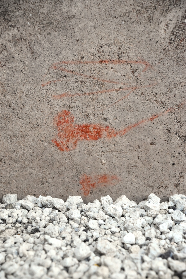 In un altro spazio identificato come un’area usata sia per lo stoccaggio/scolo delle anfore sia per scopi produttivi, su alcune pareti è apparsa un’altra serie di disegni sempre su quote non molto alte, tra i 0,20 e i 0,50 m dal piano pavimentale, probabilmente ad altezza di bambino.