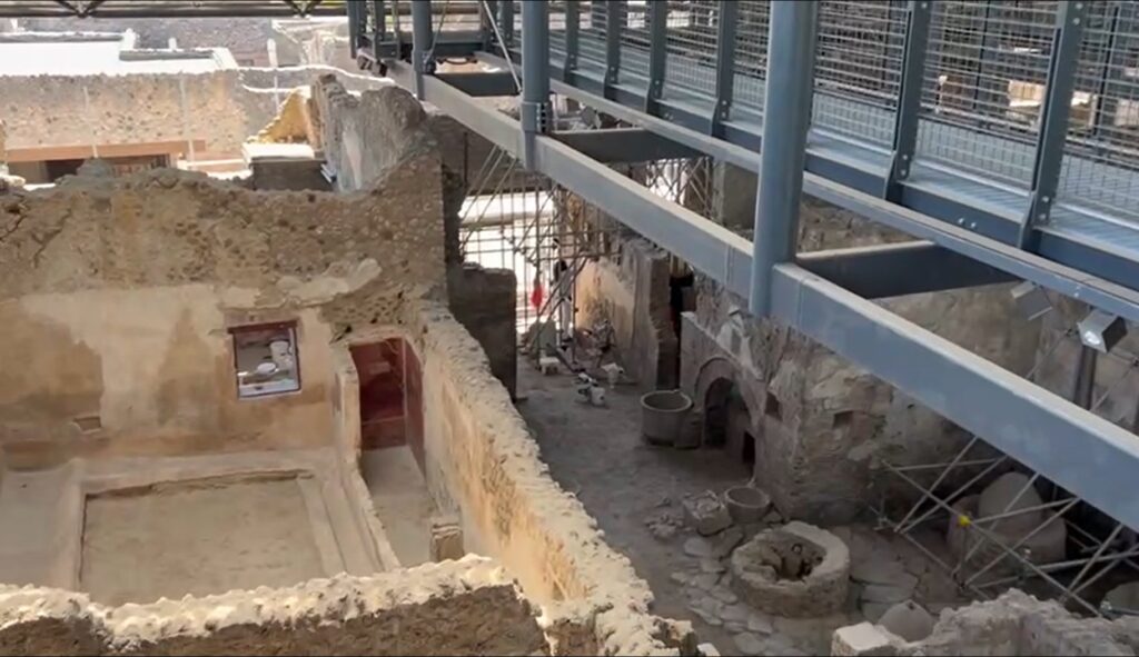 Il percorso dall’alto consentirà una visione innovativa e globale dell’intera insula, nonché dell’architettura delle case romane con l’alternarsi, come in questo caso, di ambienti vari adibiti ad usi diversi, dal produttivo al commerciale all’abitativo, oltre che dell’attività di cantiere in atto, nell’ottica di una rinnovata e migliore fruizione al pubblico.