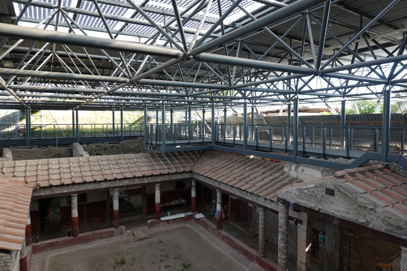 La copertura è stata realizzata con una struttura reticolare spaziale in acciaio, isolata sismicamente in testa alle colonne, la cui maglia si orienta e si dispone adattandosi alle giaciture del tessuto edilizio dell’insula. Una particolare attenzione è stata data all’impatto della copertura sul paesaggio di Pompei ed al rapporto pieno/vuoti esistente in relazione ai cortili, agli atri ed ai giardini interni all’insula.