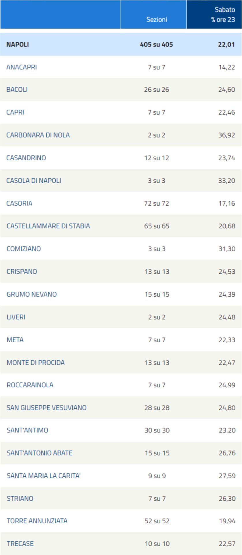 In provincia di Napoli, l’affluenza più alta nel comune di Carbonara di Nola dove i votanti sono stati il 36,92% del corpo elettorale, la più bassa ad Anacapri dove dalle 15 alle 23 di sabato ha votato solo il 14,22%.