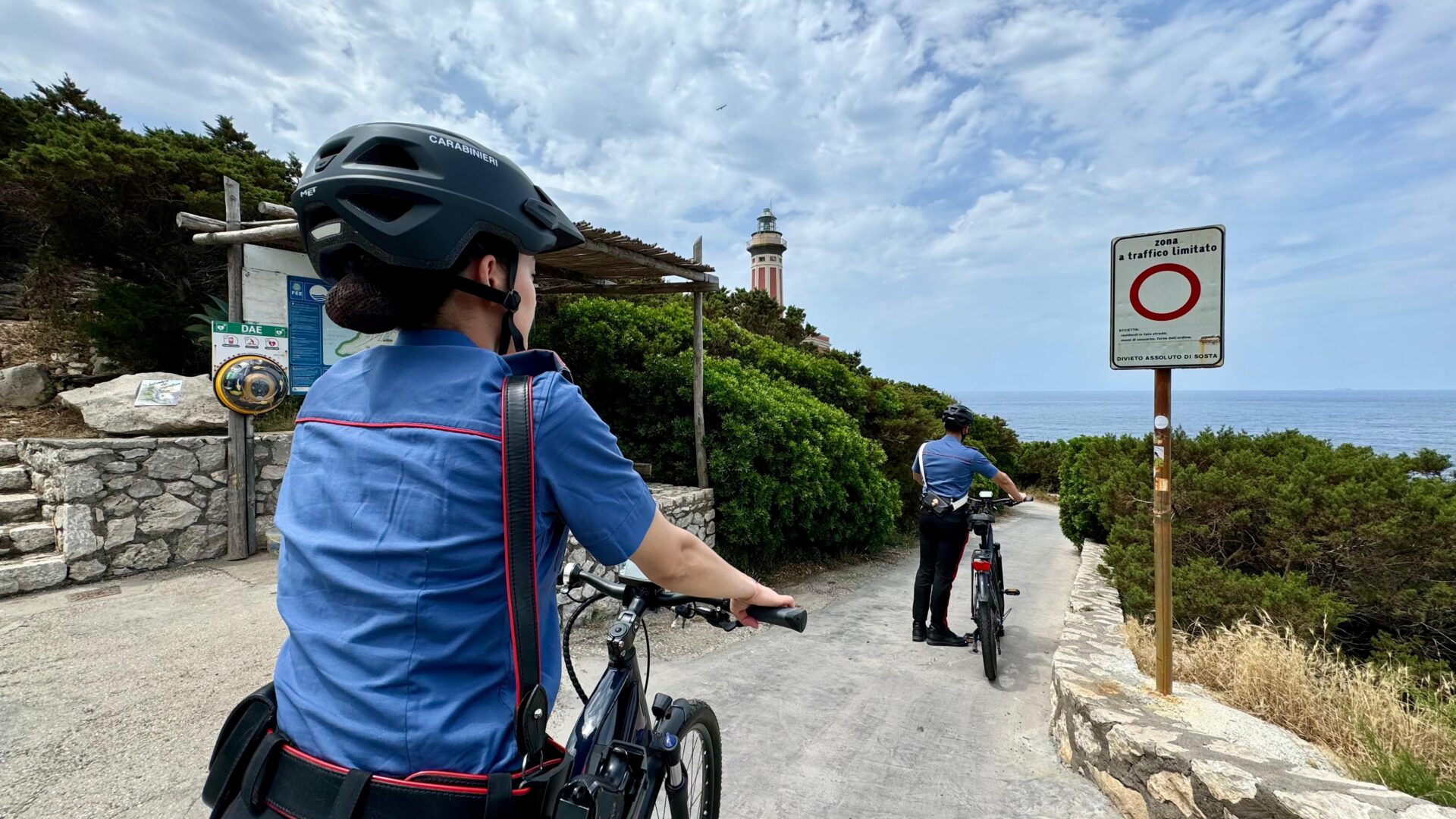 Litorale battuto anche in bici, con le dotazioni dedicate fornite dall’Arma dei Carabinieri ai comandi capresi. Uno strumento efficace per raggiungere anche le aree più aspre dell’isola e monitorare i luoghi dove il turismo irresponsabile può causare incidenti come un tuffo su scogliere pericolose e non vigilate oppure un barbecue improvvisato nella macchia facilmente preda di incendi.