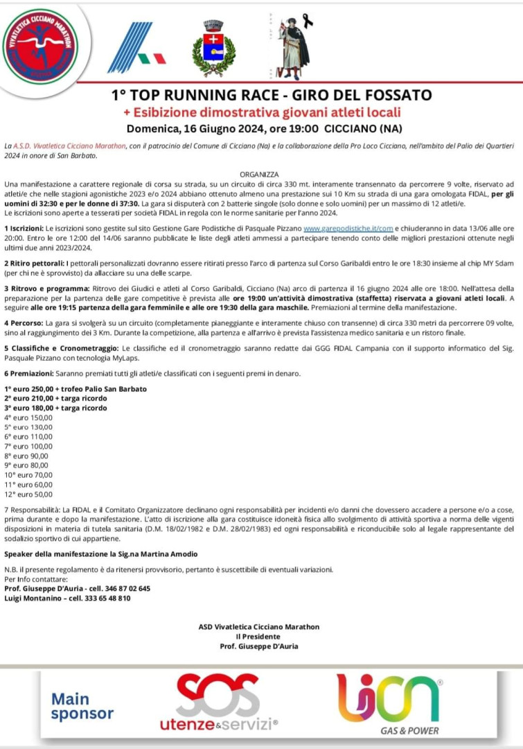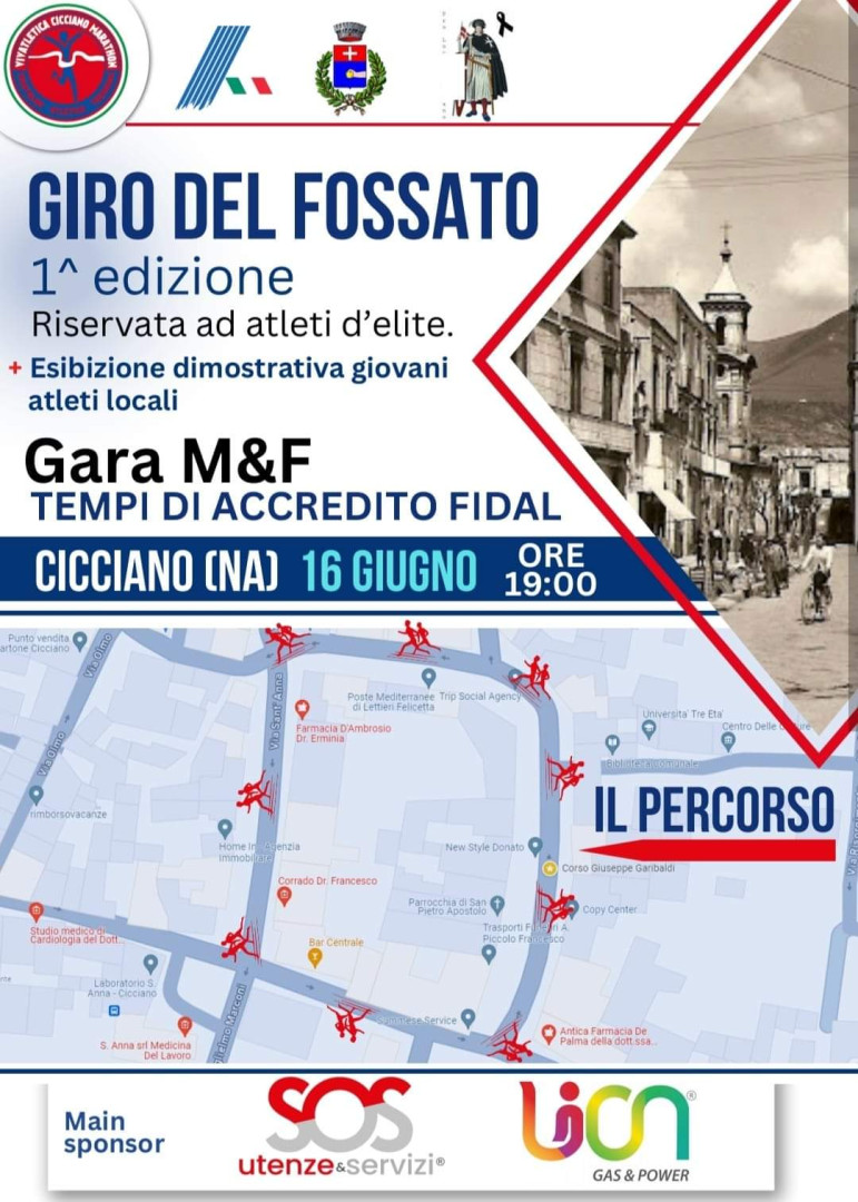 Domenica 16 giugno, alle ore 19, a Cicciano in corso Garibaldi si svolgerà la 1° edizione del “Giro del Fossato” riservato ad atleti d’elitè organizzata dalla A.S.D. Vivatletica Cicciano Marathon.