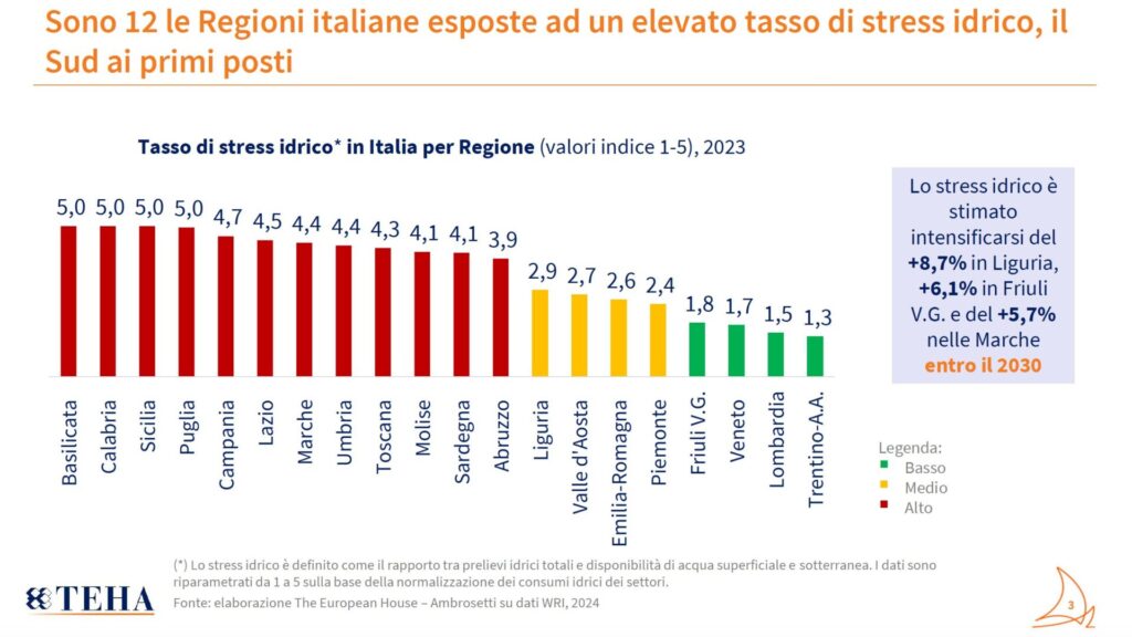 Nel 2023, temperature in crescita ed effetti dell’azione dell’uomo hanno generato nuova pressione sulla risorsa idrica. La penisola si colloca come quarto Paese dell’Unione Europea per stress idrico, con un indice di 3,3 su 5. Solo Belgio (4,4), Grecia (4,3) e Spagna (3,9) presentano valori peggiori. Sono già 12 le regioni Italiane ad elevato stress idrico: Basilicata, Calabria, Sicilia, Puglia sono le più esposte in assoluto, seguite nell’ordine da Campania, Lazio, Marche e Umbria, Toscana, Molise, Sardegna e Abruzzo. Gli esperti – riporta la Community Valore Acqua – stimano che entro il 2030 lo stress idrico si intensificherà ulteriormente in alcune regioni italiane, con un incremento dell’8,7% in Liguria, del 6,1% in Friuli-Venezia Giulia e del 5,7% nelle Marche.