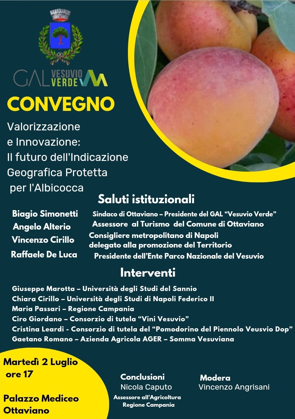 Con la denominazione di “Albicocca Vesuviana“, vengono indicate circa 100 varietà antiche e autoctone. L’area di produzione coincide con il territorio del Parco Nazionale del Vesuvio. Da anni si fregia del marchio “Igp”, indicazione geografica protetta. Nel convegno del 2 luglio a Ottaviano si parlerà delle strategie di valorizzazione del prodotto, in vista degli scenari futuri.