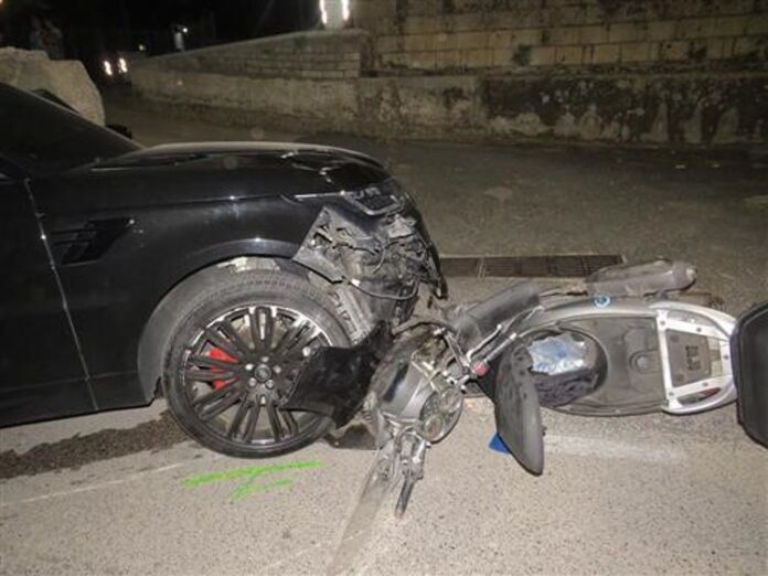 Nell’impatto, la moto è rimasta incastrata sotto la parte anteriore sinistra della Range Rover, provocando lo sbalzo del motociclista sul manto stradale.