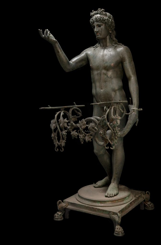 Rinvenuta alla fine del 1960 nei pressi del grande salone della casa, la statuina fu modificata con l’applicazione alla mano sinistra di un grande tralcio costituito da due serti di vite intrecciati, con grappoli e pampini, sul quale doveva esser posto un vassoio (ferculum) così da trasformarlo in un efebo “portalampade”.