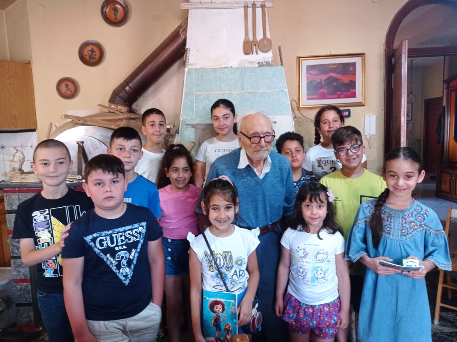 Tutti i bambini hanno mostrato cura e attenzione per nonno Domenico e questo è il valore aggiunto del percorso “Costruiamo gentilezza”. “Una volta finita la guerra – ha continuato – tornare a casa è stata un’impresa. Arrivati a Roma con il treno, abbiamo scoperto che i binari che portavano a Napoli erano stati distrutti. E così sacco in spalla, siamo arrivati in Campania camminando. Si camminava la notte e il giorno ci si nascondeva nei campi di grano turco, che faceva da nascondiglio ma anche da nutrimento. Nel corso nel nostro cammino abbiamo incontrato tante persone, donne e bambini soprattutto, eravamo tutti fratelli e ci si aiutava l’un l’altro”.