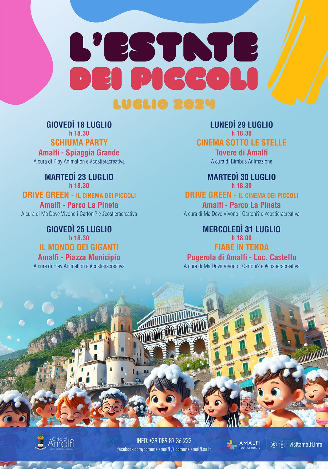 «L’estate è più allegra ad Amalfi. Il programma per i più piccoli è un’occasione di crescita che si muove attraverso le attività educative, il gioco e i laboratori ludico ricreativi, alla riscoperta della socializzazione, con un forte impatto educativo e con tante attività per stare all’aria aperta – spiega Enza Cobalto, consigliera con delega agli Eventi e alla Cultura – New entry è il “Drive Green”, il primo Drive In ecologico per la famiglia: un insieme di emozioni che i bambini possono vivere anche in compagnia degli adulti. Un’esperienza da assemblare, un pezzo dopo l’altro: un momento di gioco esperienziale in cui il bambino potrà costruire la propria auto personale. Una volta costruita la sua macchinina, potrà colorarla con i colori che meglio esprimono le sue emozioni e la sua visione fantastica del mondo che lo circonda. Poi pronti per la proiezione del cartone animato preferito! Con l’Estate dei Piccoli si impara a stare con gli altri e, allo stesso tempo, ad esprimere se stessi. È un’occasione per i bimbi anche per acquisire maggiore autonomia, sensibilizzando al rispetto reciproco. Tutti gli eventi sono dedicati ai bambini e alle loro famiglie e a chi ha scelto Amalfi come destinazione turistica. Desideriamo regalare felicità e sorrisi per un’estate indimenticabile»