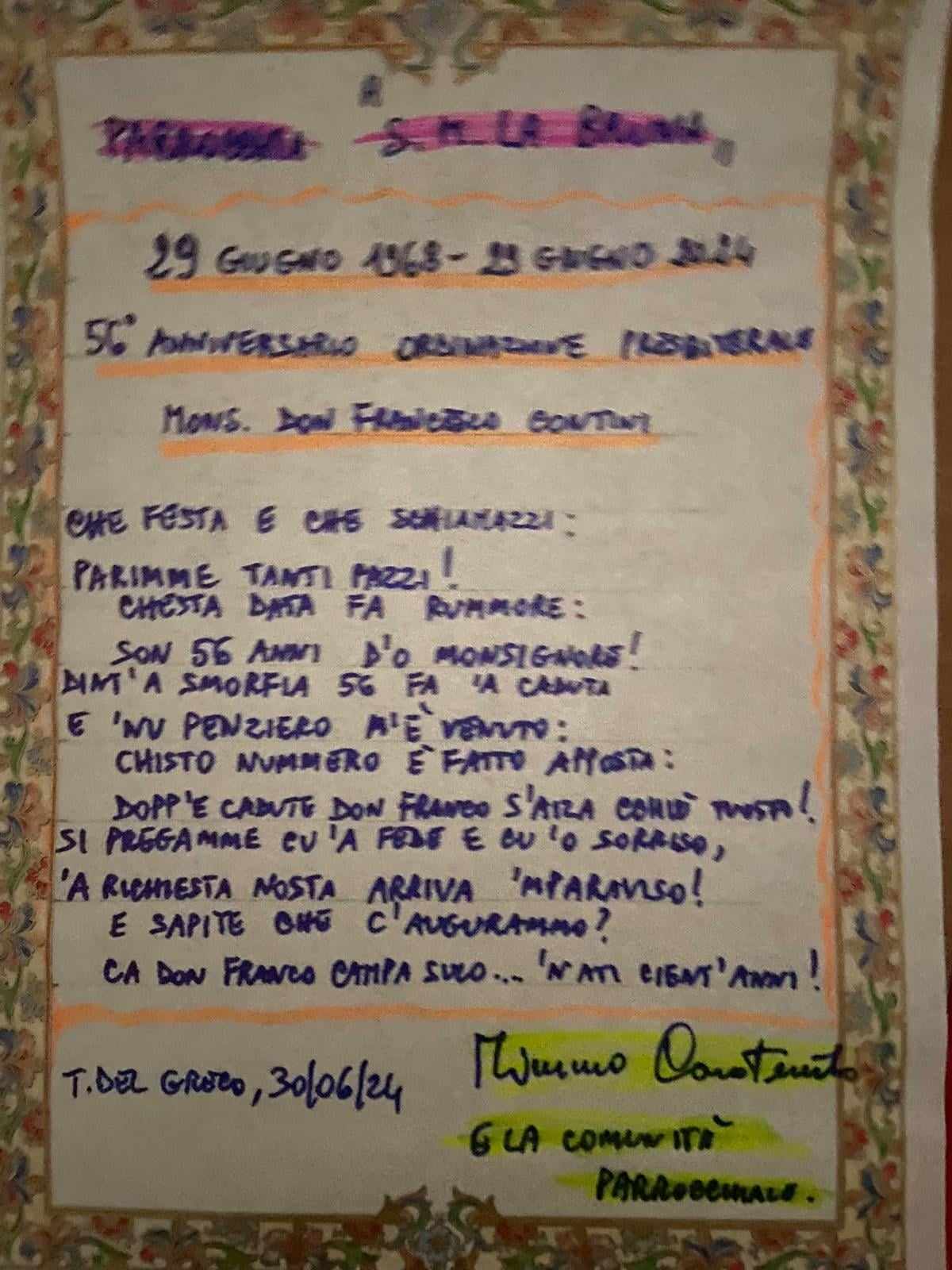 Lo scorso 29 giugno l’intera comunità della parrocchia di Santa Maria La Bruna ha festeggiato il cinquantaseiesimo anniversario di sacerdozio di Padre Francesco Contini, meglio noto come don Franco.