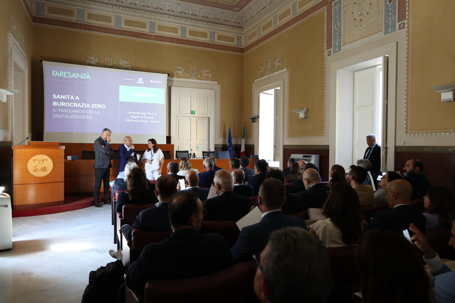 Il convegno, tenutosi presso l’Università degli Studi di Napoli Parthenope, Villa Doria d’Angri a Napoli si è sviluppato attraverso tre tavoli tecnici, ognuno con il proprio tema: “SIS – Sistemi Informatici Sanitari e ingegneria clinica: vettori del Sistema Sanitario?” moderato da Salvatore Ascione – Direttore U.O.C. Gestione Sistemi Informatici – A.O.R.N. Antonio Cardarelli di Napoli, “Il valore della comunicazione verso il cittadino e tra gli operatori nel Sistema Sanitario Regionale” moderato da Alessandra Dionisio – Responsabile Comunicazione, URP e Ufficio Stampa A.O.U. Federico II e Marco Magheri – Segretario Generale Comunicazione Pubblica, “Confronto delle best practice tra gli operatori della sanità digitale” moderato da Enzo Chilelli – Presidente Comitato degli Esperti Fare Sanità.