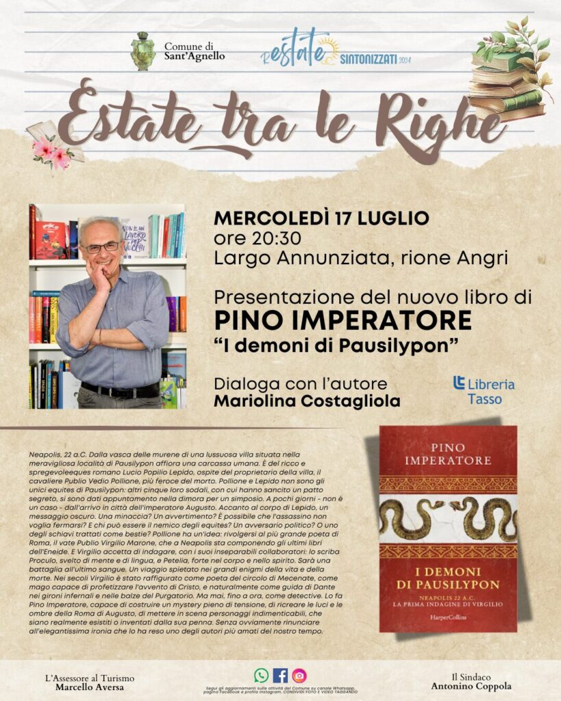 Mercoledì 17 luglio alle 20:30 al Largo Annunziata, nello storico e suggestivo rione Angri, verrà infatti presentato il suo nuovo libro, “I demoni di Pausilypon” (casa editrice HarperCollins Italia), mystery ambientato nella Roma di Augusto e denso di ironia.