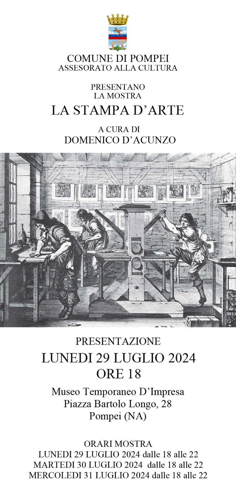 Il Museo Temporaneo d’Impresa ospiterà “La Stampa D’Arte – la mostra“, organizzata dall’Assessorato alla Cultura del Comune di Pompei nell’ambito delle iniziative a sfondo culturale proposte in linea con la candidatura a “Capitale della Cultura 2027” e curata dal prof. Domenico D’Acunzo, appassionato collezionista di stampe d’arte e bronzi della scuola napoletana. L’inaugurazione avrà luogo lunedì 29 luglio alle ore 18 e la mostra proseguirà fino al 31 luglio, a ingresso libero dalle ore 18 alle 22.