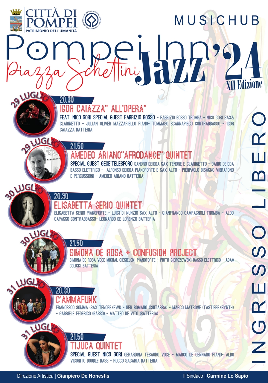 “Pompei Inn… Jazz” 2024 è patrocinato dal Comune di Pompei e organizzato da Music Hub. «Pompei, simbolo del patrimonio mondiale e destinazione quotidiana per turisti da ogni angolo del pianeta – ha detto il sindaco Carmine Lo Sapio – non poteva non ospitare un evento che parla un linguaggio universale come il jazz. Anche in questa edizione di “Pompei Inn… Jazz”, questo genere musicale sarà celebrato attraverso le esibizioni di artisti di fama internazionale. L’evento rappresenta per Pompei l’opportunità di rafforzare il suo impegno verso una cultura musicale ricca e diversificata come il jazz, oltre che verso i valori educativi, formativi e civici che il jazz trasmette e che l’avvocato De Honestis si impegna a promuovere e consolidare».