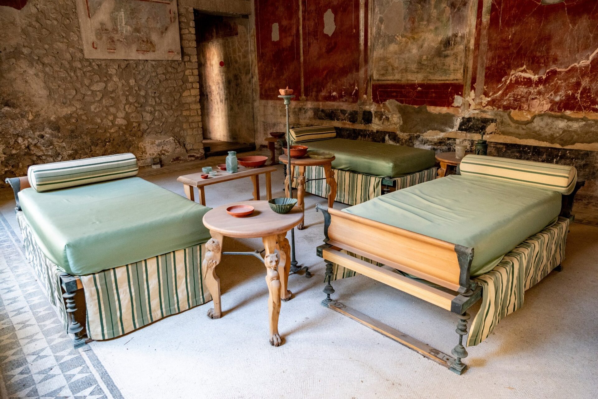 Il grande triclinio presenta i letti su cui si mangiava semisdraiati, i tavolini e il ricco vasellame, sia in bronzo che in vetro e ceramica, utilizzato per i banchetti. Inoltre, nella villa saranno esposti tre calchi precedentemente visibili all’Antiquarium, che da domani chiuderà per lavori di manutenzione straordinaria e riallestimento di alcune sale espositive.