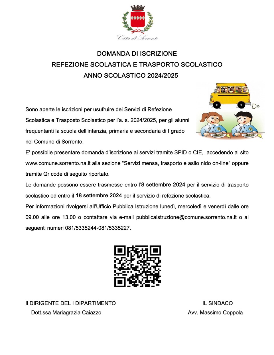 Sono aperte le iscrizioni per usufruire dei servizi di refezione e trasporto scolastico, riservati agli alunni della scuola dell’infanzia, primaria e secondaria di I grado del Comune di Sorrento.