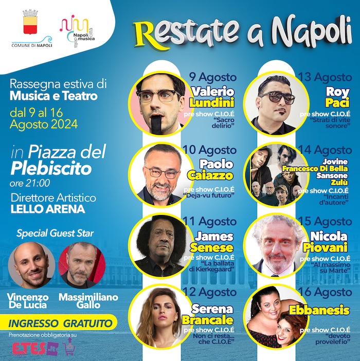 Le serate saranno presentate dall’attore Biagio Musella con gli interventi comici di Alessandro Bolide e del trio “Gli Ancora No” con le special guest Massimiliano Gallo e Vincenzo De Lucia in interventi tra teatro d’autore e comico. Poi spazio a tanta musica con il Premio Oscar Nicola Piovani, il fenomeno nazionale dell’urban jazz Serena Brancale, i ritmi latin ska del trombettista Roy Paci, la comicità surreale di Valerio Lundini, in scena con la sua live band, i concerti di diciotto tra bands e solisti partenopei dove spicca Jovine con importanti ospiti e un Gala di Danza dell’ACSI. Infine il tributo a James Senese che torna ad esibirsi al Plebiscito dove incontrerà, dopo anni, Lello Arena.