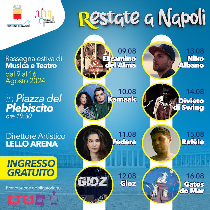 “La quarta edizione della rassegna estiva “Restate a Napoli” propone al pubblico napoletano e ai numerosi turisti in città spettacoli dal vivo di musica, danza e teatro completamente gratuiti. Agosto è, anche quest’anno, un mese ricco di eventi. Sono molto soddisfatto dell’iniziativa e del percorso tracciato da Napoli Città della Musica, conferma dell’impegno nel rilancio del comparto musicale e audiovisivo. Il palcoscenico di Piazza del Plebiscito vedrà la partecipazione, di nuovo, degli allievi dell’accademia diretta da Lello Arena, C.I.O.E, un’opportunità concreta di formazione – alla sua seconda edizione – per i giovani talenti di questa città. Ed è questo un passaggio fondamentale per la valorizzazione e lo sviluppo di competenze nel settore. L’investimento nella formazione di nuovi talenti, progetto condiviso anche nella cornice di Cohousing Cinema Napoli, è parte di un percorso che sostengo con convinzione e che vede, allo stato attuale, i suoi frutti nel fermento culturale che anima la città”. Così il sindaco di Napoli Gaetano Manfredi.
