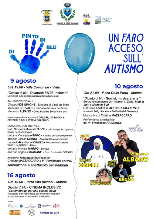 “Dipinto di blu” nasce dall’idea di affrontare l’autismo senza paura ma con il sorriso, ed è per questo che il 10 agosto, alle ore 21 si entra nel vivo della manifestazione con una serata di vero e proprio divertimento, presso piazza Attilio Della Porta a Marina di Vietri sul Mare, una serata all’insegna della comicità che avrà come protagonisti i comici di ZELIG e Made in Italy: Vincenzo Albano, Gianni Cinelli e Luca Bruno.