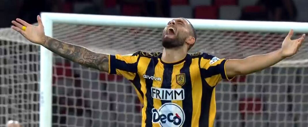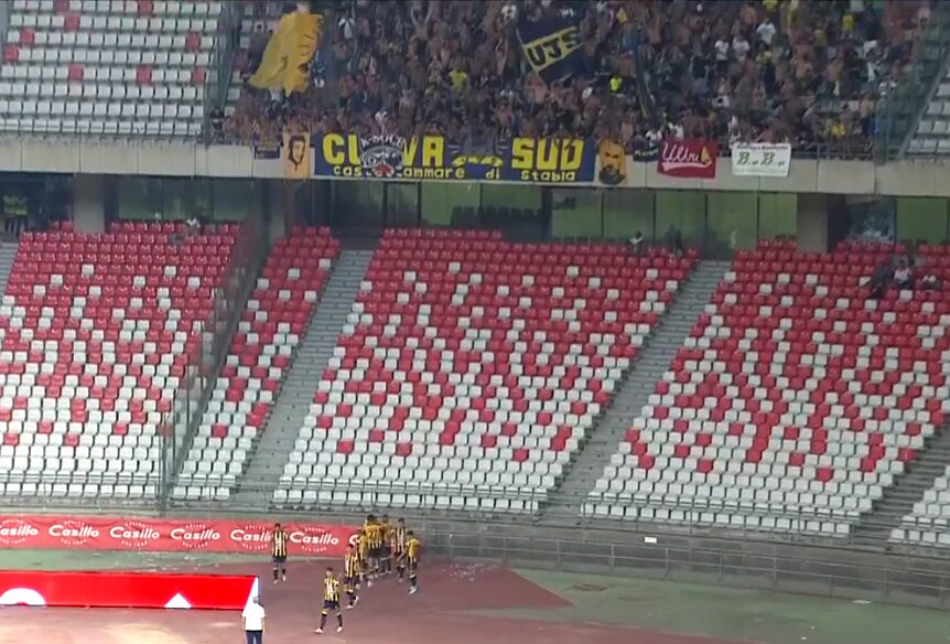Al 24′ Juve Stabia in vantaggio: angolo da sinistra battuto da Leone, Bellich, nel cuore della difesa stabiese, di testa insacca.