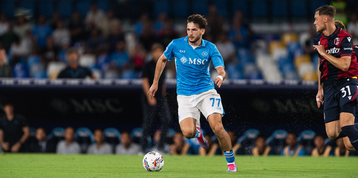 Il centrocampo rossoblù non si cura dell’azione personale di Kvaratskhelia che s’invola, lascia sul posto Lucumì e insacca la rete del 2-0, approfittando di una deviazione di Beukema.
