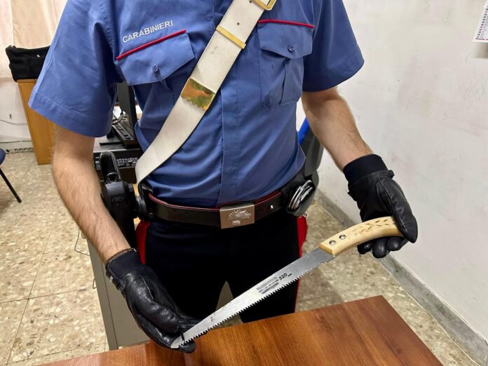 L’uomo è incurante della presenza della pattuglia e si avvicina parcheggiando a pochi metri. Il fare é aggressivo e non c’è scampo ad alcun equivoco. Il 30enne è armato, impugna una lama, in pratica un seghetto da giardinaggio, con una lama lunga 32 centimetri, e vuole aggredire la propria madre.