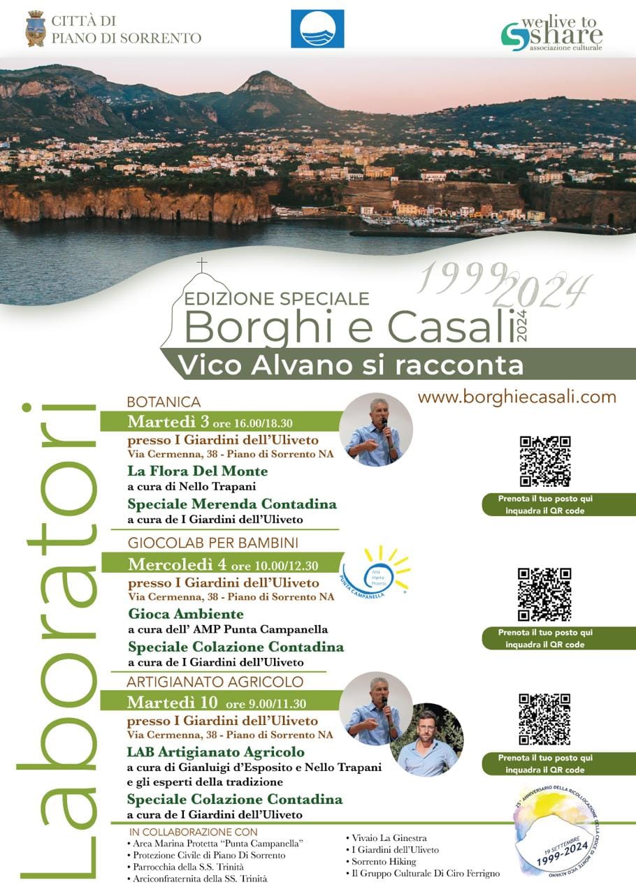 Il viaggio alla scoperta di Vico Alvano attraverso l’Edizione Speciale di Borghi e Casali, nel dettaglio, inizia presso Giardini dell’Uliveto coi seguenti appuntamenti: