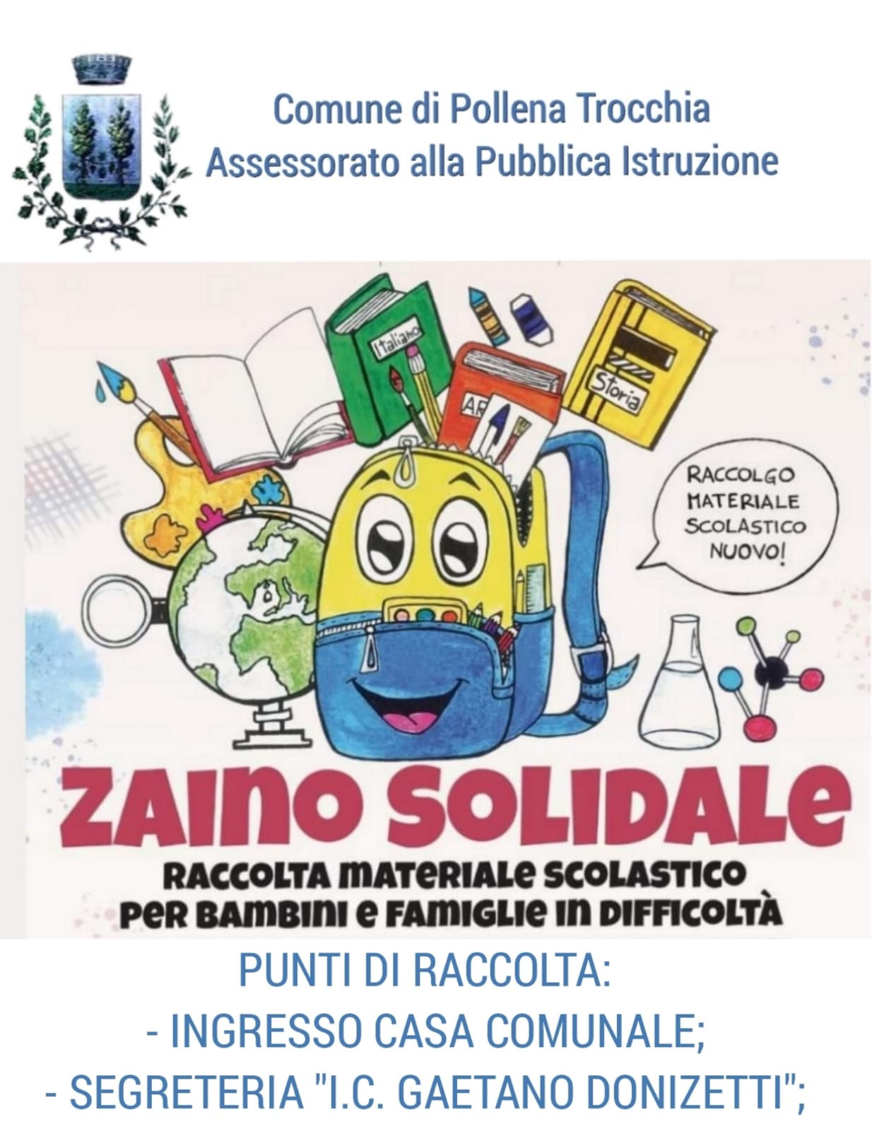 Di qui l’idea della prima edizione dello zaino solidale, che mette insieme diritto allo studio e solidarietà» ha spiegato l’assessore alla Pubblica Istruzione del Comune di Pollena Trocchia, Arturo Cianniello, che in mattinata ha effettuato un giro dei plessi scolastici cittadini dell’I.C. Donizetti per consegnare materiale pubblicitario dell’iniziativa, trovando un’accoglienza favorevole ed entusiasta nei confronti della stessa. Il meccanismo dello zaino solidale è semplice: nella casa comunale e presso la segreteria dell’Istituto comprensivo dell’I.C. Gaetano Donizetti sono state posizionate delle ceste che potranno essere riempite da chi vorrà con materiale d’uso per gli alunni delle scuole.